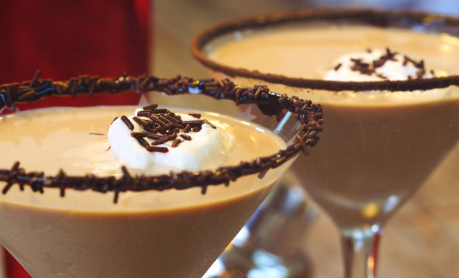 Directions: Coat rims of martini glasses in honey, then dip in chocolate sprinkles. In a cocktail shaker with ice, shake together milk, cherry juice, and vodka. Pour into glasses and top with any leftover sprinkles.