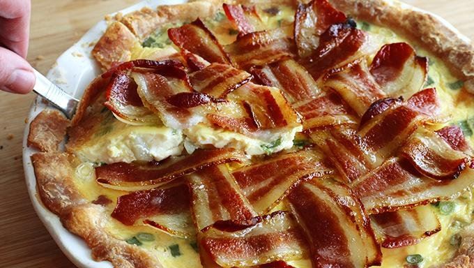 Take all your favorite breakfast ingredients -– bacon, eggs, hash browns, cheese, milk – and combine them into a glorious breakfast pie. Then add a bacon lattice on top and the creation is complete!