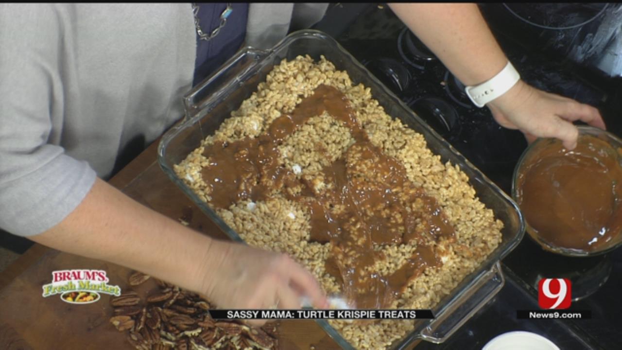 Continuing my series of yummy fall treats I really shouldn’t make or eat but they look too awesome not share, have some Turtle Krispie Treats, created by Sassy Mama, in conjunction with Braums and KWTV-Channel 9 in OKC. Tell me this doesn’t sound wonderful!