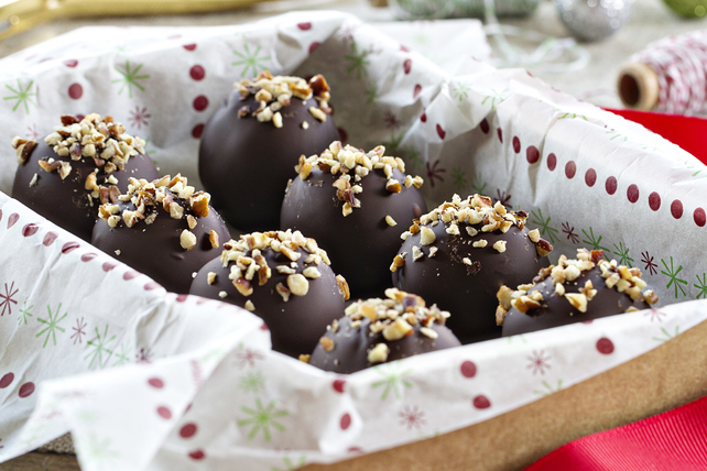 Shape into 42 (1-inch) balls. Freeze 10 min. Dip balls in melted chocolate; place in single layer in shallow waxed paper-lined pan. Sprinkle with nuts.