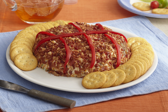 Form into basketball shape on platter. Coat with bacon bits. Add pepper strips for the stitching. Serve with crackers of your choice.