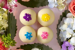 Shape into 40 (1-inch) balls. Freeze 10 min. Dip balls in melted chocolate; place in single layer in shallow waxed paper-lined pan. Fit tubes of icings with star tip; use to pipe small flower onto top of each ball. Gently press nonpareil into center of each.