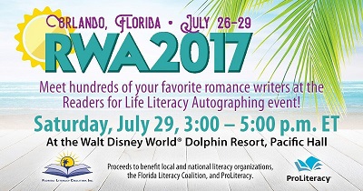 So, I’ll be landing in Orlando about noon today, then I’m headed to the Walt Disney World Resort Dolphin hotel. Hopefully, I can grab an early check in. Keep your fingers crossed for me. If not, I have friends already there who will let me stash luggage and smooze with them. The Romance Writers of America National Conference is a week of amazing reconnecting with friends, learning new things, networking with publishing professionals and parties. Fun–if exhausting times! This year, the “finale” is the Literacy for Life signing.