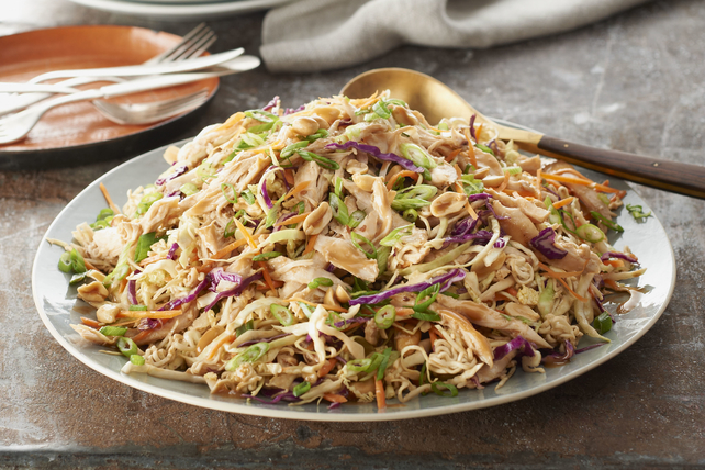 Break Noodles into small pieces in large bowl. Add coleslaw blend, chicken, onions and nuts; mix lightly. Discard Seasoning Packet from soup mix or reserve for another use. [As near as I could figure, this recipe calls for using uncooked Ramen noodles. I guess the noodles soak up the dressing? Anyway, I’ve never made it that way. I cook the noodles because NOODLES!]