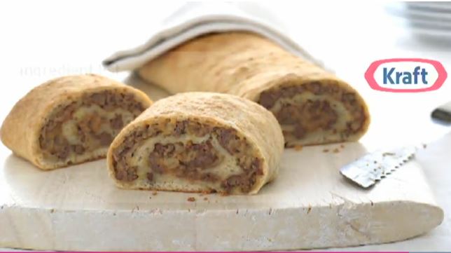 3 – Unroll pizza dough onto baking sheet sprayed with cooking spray. Press into 15×8-inch rectangle; top with meat mixture. Roll up, starting at one long side. Rearrange if necessary so roll is seam side down.