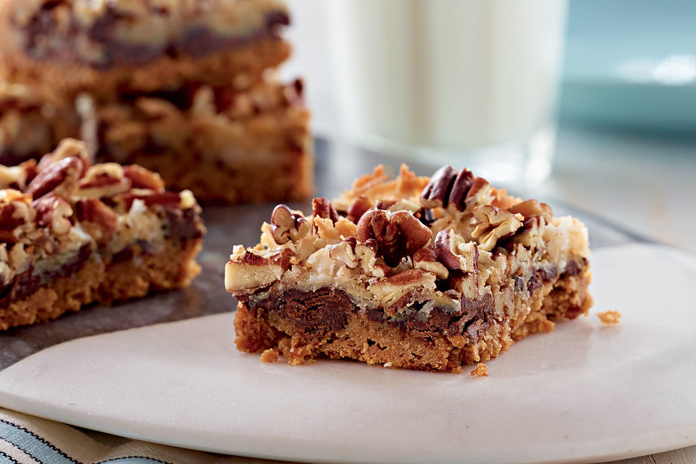 3 – Pour condensed milk over crust; top with layers of remaining ingredients. Press nuts lightly into coconut layer.