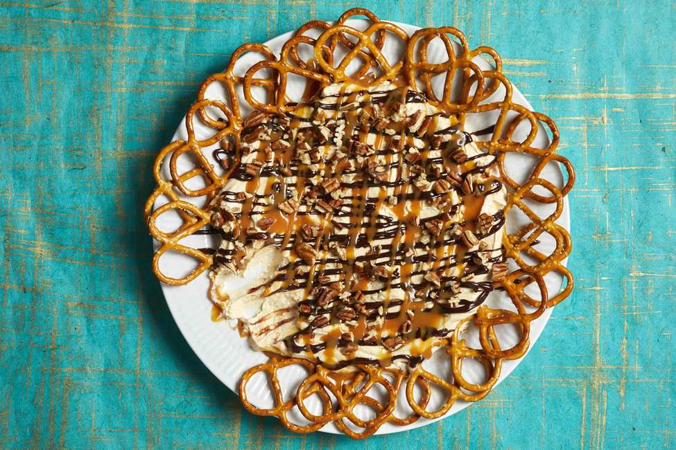 4 – Spread cream cheese mixture onto serving plate; drizzle with chocolate sauce and remaining caramel sauce. Sprinkle with nuts.