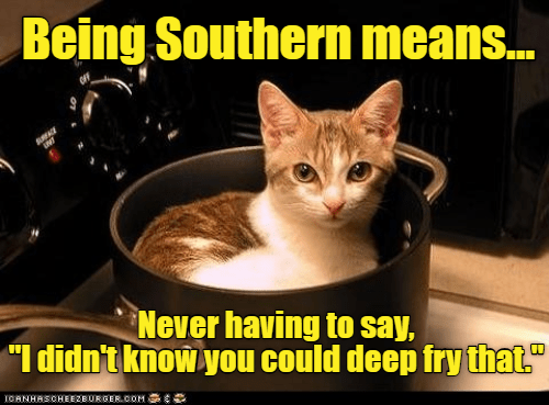 ROFL… that kitten meme! Too funny! Being from the north, I will never understand deep fried butter.