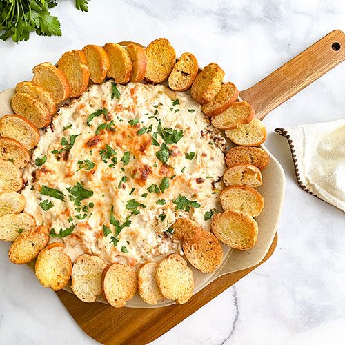 This dip is best served hot but can easily be reheated as needed. Store the leftover dip in an airtight container in the fridge for up to 3 days. The crostini (see cook’s tip) is perfect for dipping, but you can also serve the cheesy shrimp dip with pita chips, crackers, or naan.
