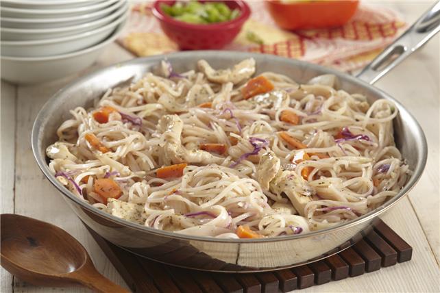 Plate our Pancit Noodles with Chicken for a delicious entrée this evening. Tender rice noodles are the key ingredient in our Pancit Noodles with Chicken recipe, which includes chopped veggies and a tasty coleslaw blend.