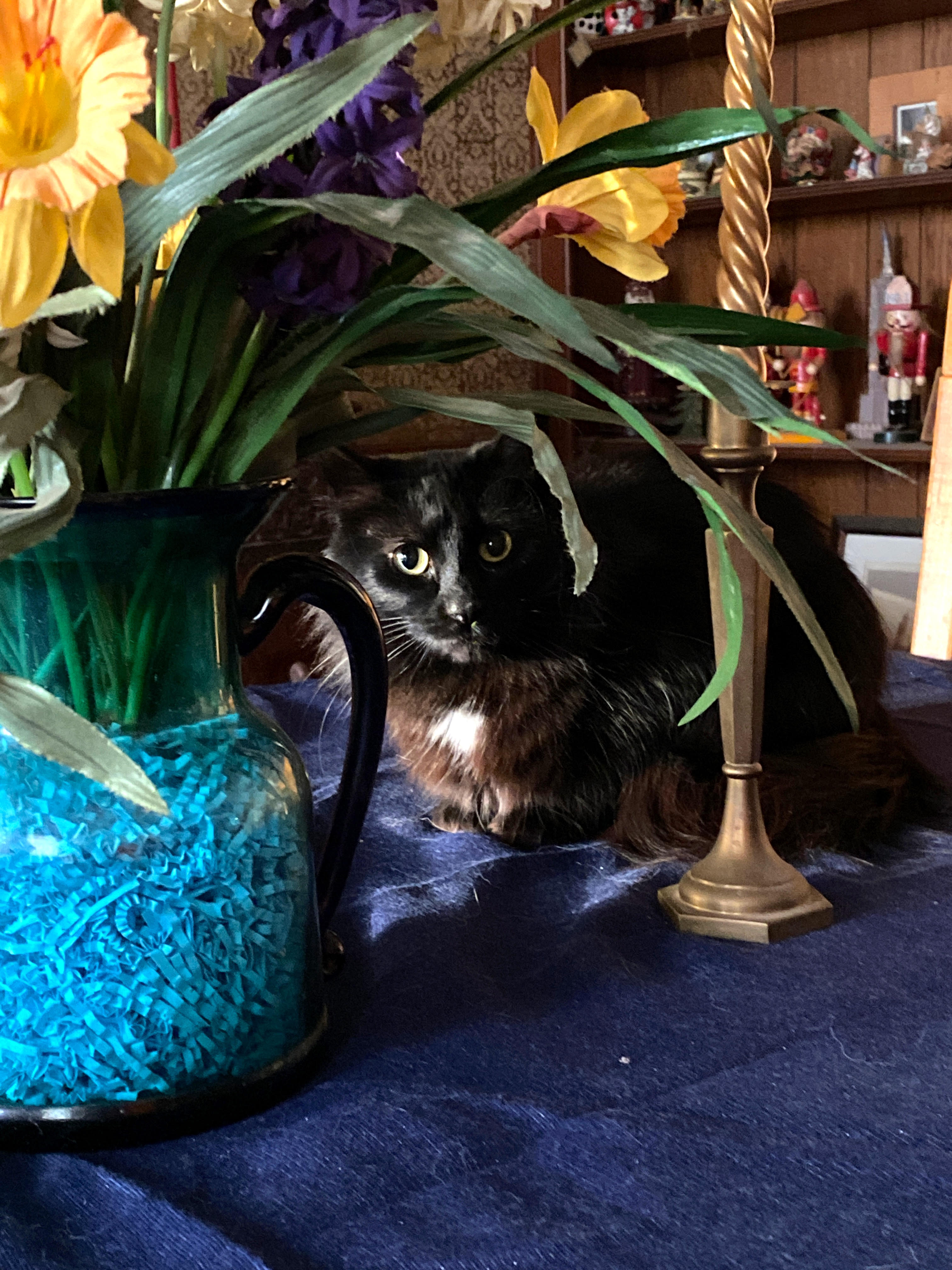 And my final random thing is a pic of Loki playing hide-n-seek with the flowers on the dining room table. Since I started the week with a pic of Pistol Pete, who is currently BACK in the garage and who pooped in my laundry basket on clean clothes I hadn’t put up yet (and yes, they ARE all rewashed, deoderized and put away, which will teach me to put away the launder ASAP), I thought I would share the cuteness that is Loki, Demon Cat of Mischief and Mayhem.