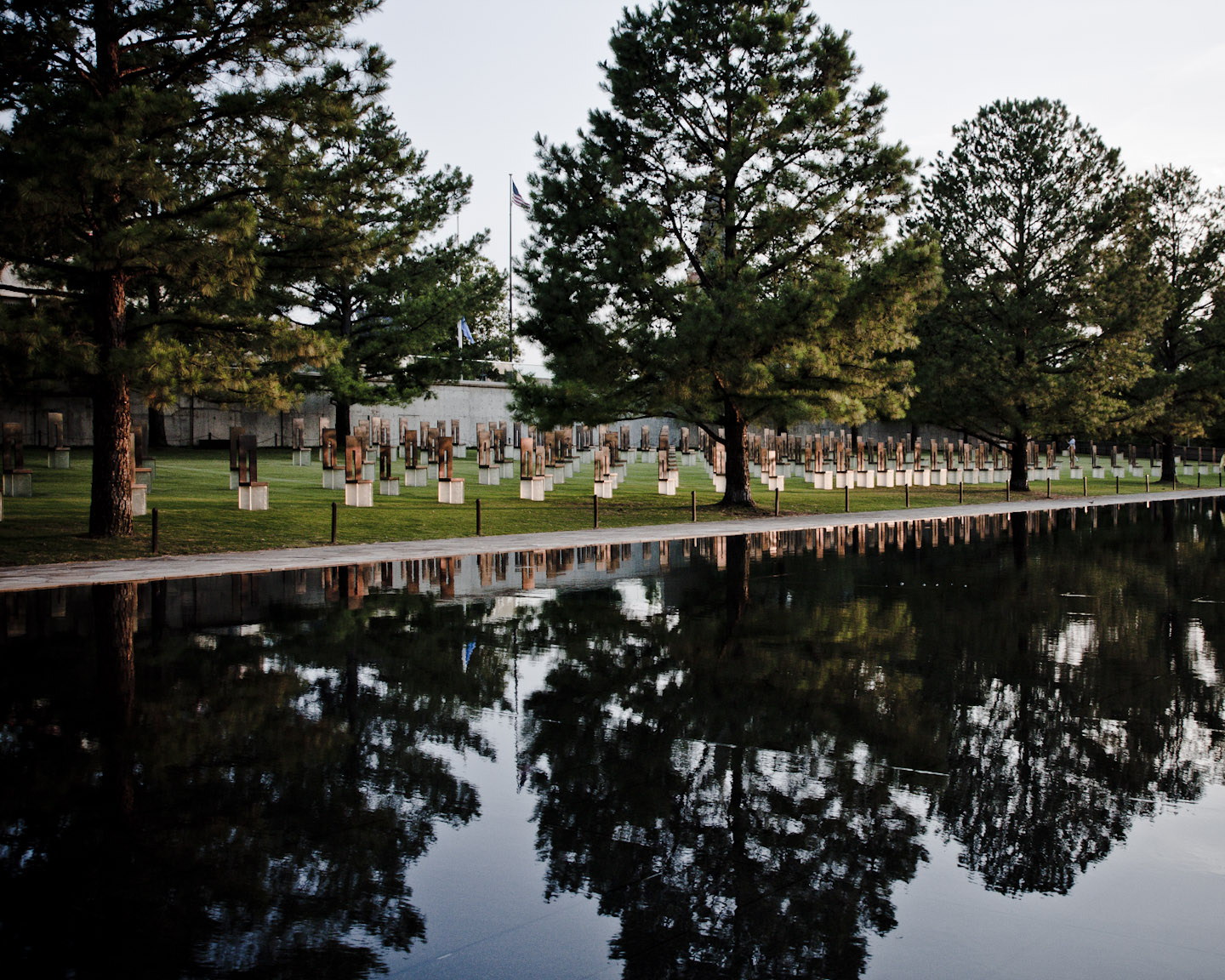 OKC Murrah Bombing Memorial: chairs and reflection pool ©2013 Clary Carey, photo used with permission