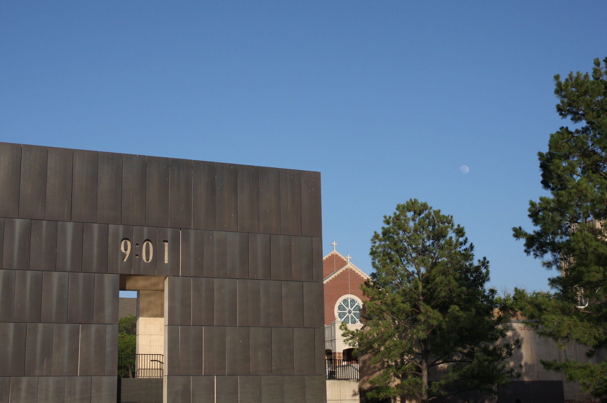 This gateway, made of granite panels, depicts the time–9:01 a.m.–the moment time stopped in downgown Oklahoma City. ©2013 Clary Carey, used by permiossion,